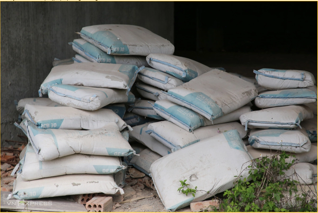Xi măng khô cứng chất đống dưới tầng 1 tòa nhà.