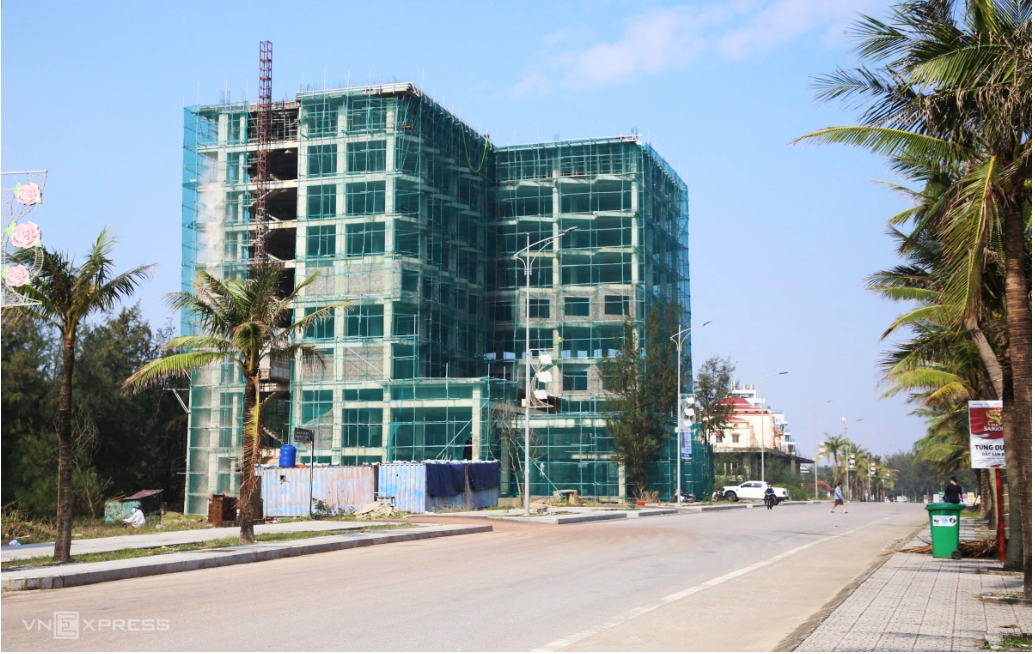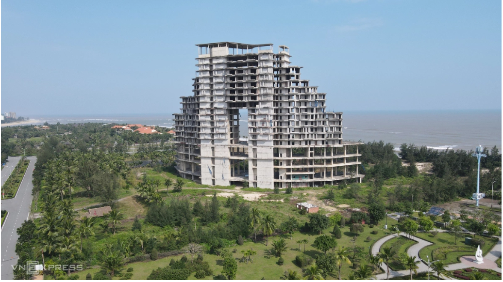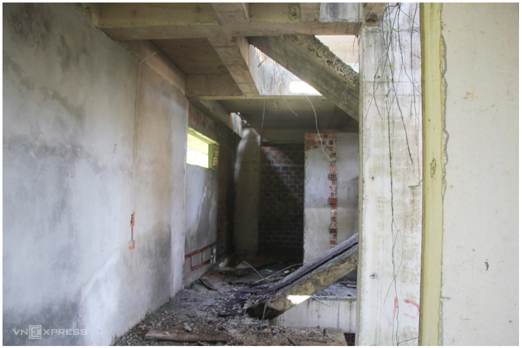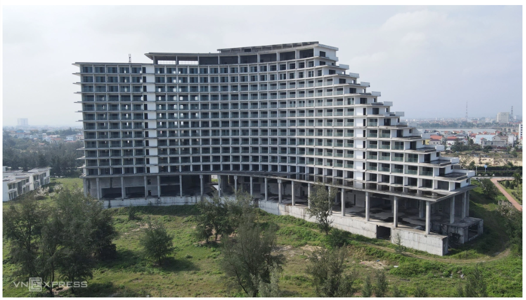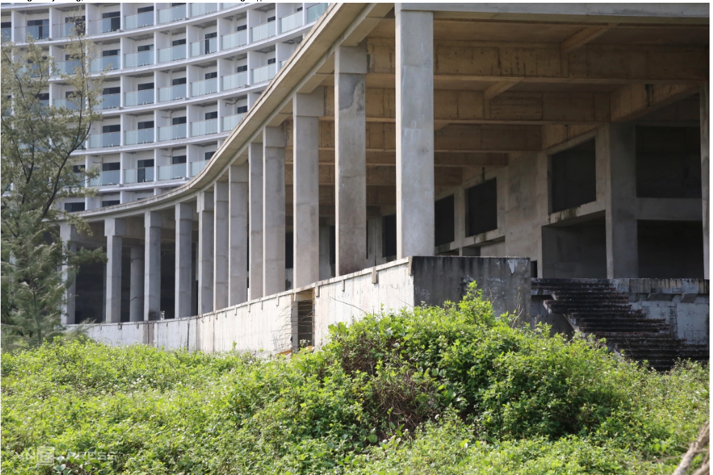 Khách sạn chưa hoàn thiện, bỏ hoang nhiều năm, xung quanh khuôn viên cây cỏ mọc um tùm, không có người thi công.