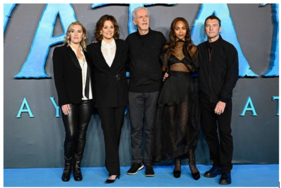 Êkíp "Avatar 3", từ trái qua: minh tinh Kate Winslet, Sigourney Weaver, đạo diễn James Cameron, Zoe Saldaña và tài tử Sam Worthington. Ảnh: Disney