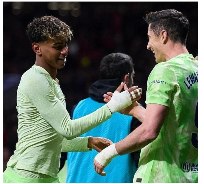 Yamal và Lewandowski mừng bàn thắng với mỗi người một tay được quấn băng ở vùng cổ tay. Ảnh: EFE