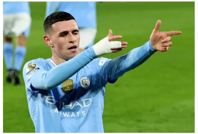 Foden mừng bàn thắng với băng trắng quấn hai ngó giữa và phần lớn bàn tay đến cổ tay. Ảnh: Reuters